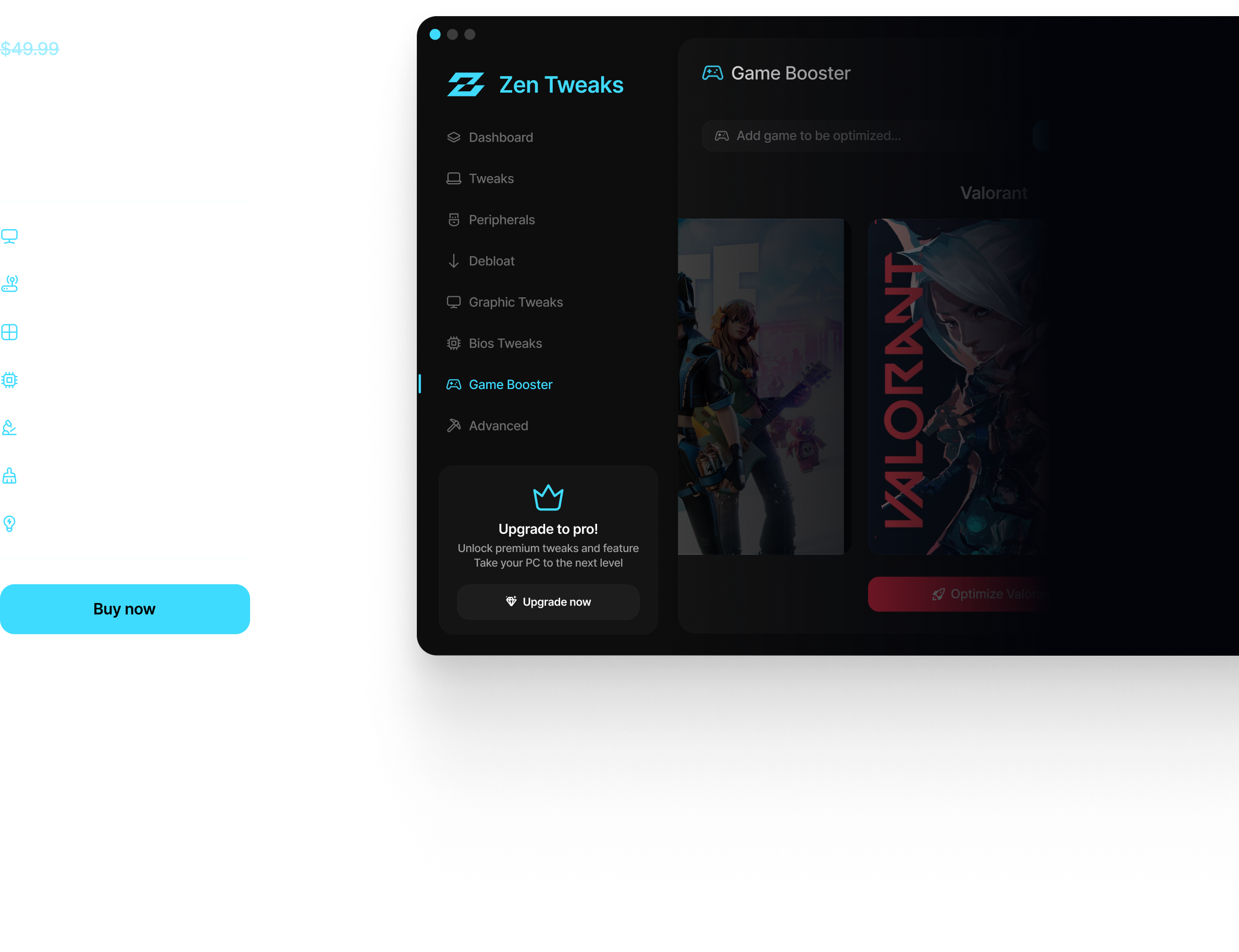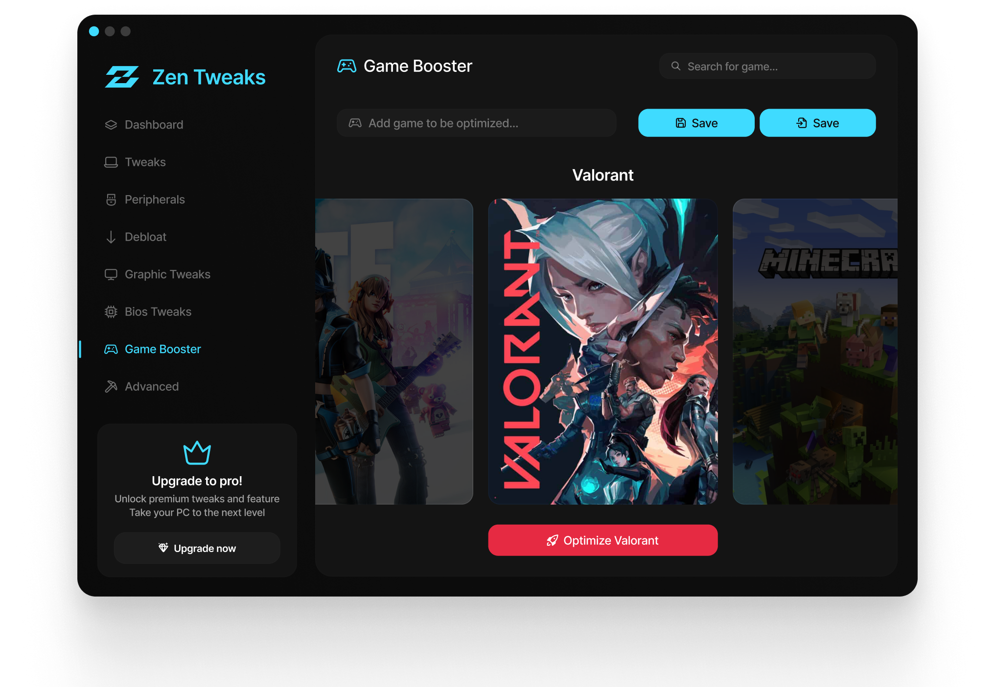 Zen Tweaks optimizes your entire Windows system, which benefits all games. We also offer game-specific profiles for popular titles like Valorant, Fortnite, and Call of Duty to maximize performance.